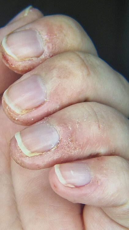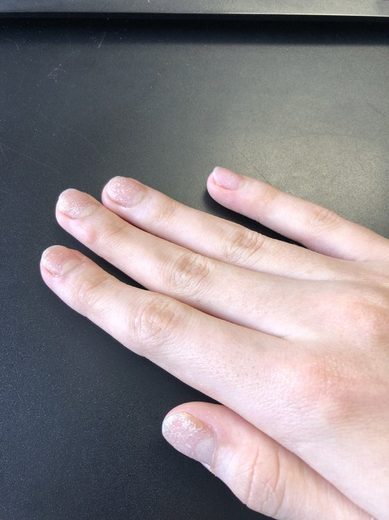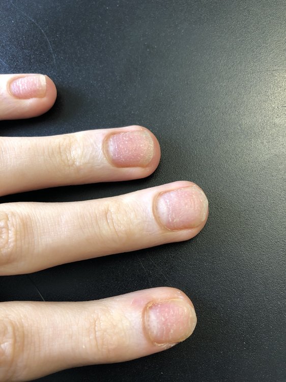 Hallo zusammen, Ich leide seit Geburt an Neurodermitis, mal stärker, mal schwächer. Letzten Sommer wieder stärker als sonst. Darauf haben sich auch meine Nägel verschlechtert. Die Neurodermitis ist im laufe des Sommers wieder verheilt, jedoch die Psoriasis wurde immer stärker bis alle Nägel (auch Füsse) davon betroffen waren. Der Hausarzt leitete mich zum Hautarzt weiter. Dieser gab mir Cortison welches aber nur fettet und nicht wirklich heilt. Daraufhin gab er mir noch eine Vitamin D3 Salbe, die half absolut gar nicht. Da der Hautarzt nun nicht mehr weiter weiss und er es komisch findet, dass alle Nägel davon betroffen sind, leitet er mich an einen Nagelspezialisten weiter. Da ich nun aufgrund der langen Wartezeiten noch nichts gehört habe, wollte ich euch fragen, ob ihr vielleicht noch Tipps habt. Cortison und Vitamin D3 hilft bei mir also nicht wirklich. Ihr seht meine Nägel im Anhang. Über eure Hilfe bin ich dankbar. Joel