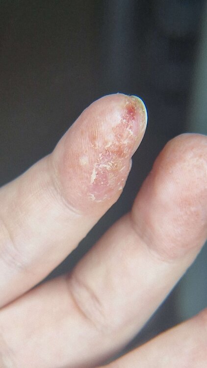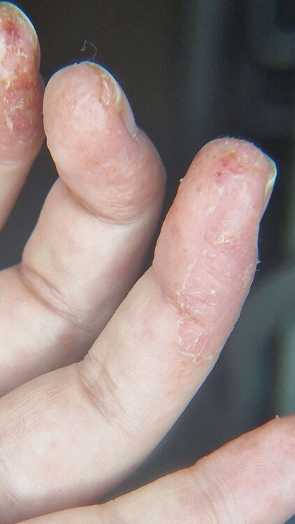 Ein freundliches Hallo in die Forumsrunde, ich möchte das Thema Hand- und Nagelbeteiligung gerne wieder etwas nach vorne schieben. Vor ca. zwei Jahren meldete sich die Psoriasis nach 35 Jahren wieder bei mir, damals waren die Kopfhaut und hinter den Ohren betroffen. Allerlei schreckliche Salbenmixturen damals durch den Hautarztverschrieben bekommen, da half nix bis es von allein plötzlich wieder weg gegangen ist. Nun bildeten sich vor ca. 2 Jahre an beiden Handinnenflächen kleine rote Stellen die immer größer wurden und dann bekannt silbrig schuppig wurden. Verschiedene Dermatologinnen aufgesucht, Hautstanze = Diagnose psoriasisformes Handekzem, verordnet wurde Diprosalic, dann Ecural plus Cortisonstoßtherapie oral, dann Enstilar, dann handgemischte Cortisoncreme durch die Apotheke, Prednicarbat Fettsalbe und PUVA. Das Ergebnis= nichts hat geholfen, es wurde eher noch schlimmer, sogar dass mit der Zeit nun alle Fingernägel schrecklich mit betroffen sind und sich der erste Nagel lockert und ausfallen wird oder operativ entfernt werden muss. Mit meinen derzeitigen Fingernägeln ( die Füße sind nicht betroffen ) könnte ich mich bei der Herr der Ringe als Ork bewerben..... In meiner Not habe ich mich ambulant in die chefärztliche Behandlung der ansässigen Universitäts-Hautklinik begeben. Ich durchlief das übliche Procedere, Hautstanze, Allergietestung, Mykosenabklärung..die Diagnose= palmoplantare Psoriasis mit Nagelbeteiligung und Hinweis auf Psoriasis Arthritis ( ach ja, die Gelenkprobleme vergaß ich ).Ohne Schutzhandschuhe geht gar nichts, auch aus optischen Gründen 😔 Dies alles drückt schon ganz ordentlich auf die Psyche 😔 Da die topische Behandlung keinerlei Hilfe brachte, es sich eher noch verschlimmerte, wurde mir die Cosentyx Behandlung als systemische Therapie empfohlen. Nach Abklärung mit meiner Privatkasse startet nun die Injektionstherapie mit den bekannten vier Wochen je 300mg in der Woche, danach ab der 5. Woche 300mg einmal im Monat. Aktuell werde ich mir diese Woche die 2. Ladung ( 2x 150mg ) subcutan verabreichen. Nun würde mich interessieren wie es anderen mit ähnlichen Symptomen ergangen ist oder noch ergeht, welche Tipps evtl. gegeben werden können durch individuelle Erfahrungen, wie lange es unter Cosentyx dauerte bis es positive Veränderungen gab oder auch keine, auch, was die Erkrankung mit euch macht, usw. usw... ich bin z.B. auch zusätzlich in einer psychologischen Betreuung und werde hier einmal berichten wie es insgesamt weitergegangen ist. Über Rückmeldungen würde ich mich sehr freuen, ich wünsche allen Betroffenen einen positiven Behandlungsverlauf👍