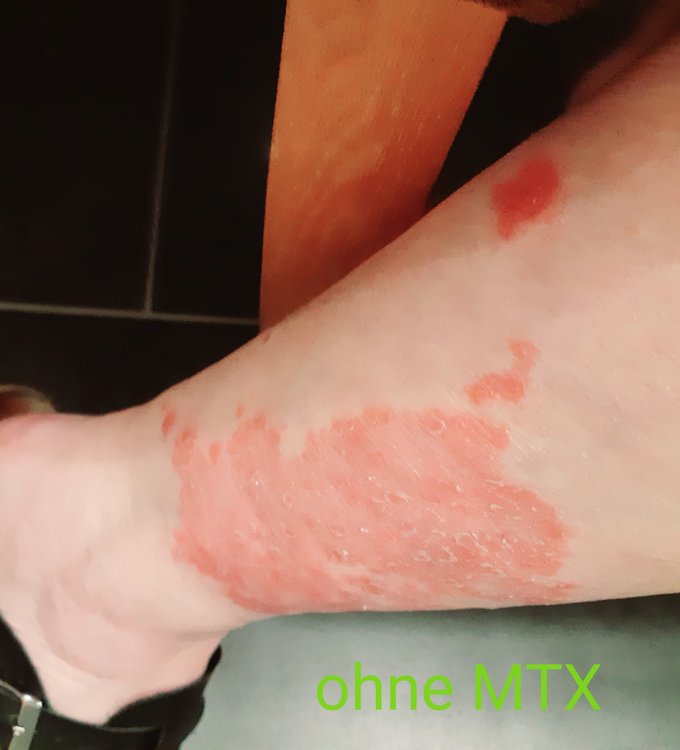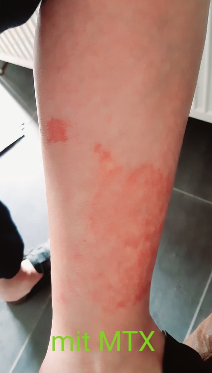 Hallo zusammen, ich mal wieder 🙂 Seit 13 Wochen Spritze ich mir nun MTX, mittlerweile habe ich Nebenwirkungen wie Haarausfall, Übelkeit ohne erbrechen und Kopfschmerzen. Manchmal meine ich schlechter Luft zu bekommen oder Druck auf der Lunge zu haben. Meine Lunge wurde aber schon abgehorcht, war alles ok. Am meisten belastet mich diese starke Müdigkeit und Schlappheit. Ich lade nun mal zwei Fotos hoch. Diese zeigen meinen rechten Unterschenkel, mein linker sieht genauso aus. Meine Fragen an die MTX Patienten hier: Ist das ein gutes Ergebnis nach 13 Wochen? Wird das Hautbild noch besser? Meine Gelenke zeigen noch keine Besserung, wann setzt diese denn ein? Ich nehme auch Folsäure einen Tag nach dem Pen. Ich weiß nicht wie lange ich die Nebenwirkungen noch durchhalte und hoffe nach Bad Bentheim zu kommen. Gruß Carmen