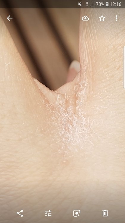 Ich weiß, viele von euch werden lachen, wenn sie das "Ausmaß" sehen. Zur Zeit nutze ich zweimal am Tag Kortisonsalbe, meist Advantan (0,1%), aber manchmal auch Karison (0,5%). Ich denke, zu dieser Verschlechterung hat der Konsum von Fleisch (Geflügel) beigetragen, aber auch vermehrter Stress. Im Genitalbereich hat es wieder nachgelassen, dafür tut sich wieder mehr auf dem Kopf. Wenn ich von der Salbe absehen würde oder gar mit Urea cremen, dann würden sich die weniger dicken Stellen wieder öffnen und darin sehe ich das Hauptproblem. Deshalb habe ich überhaupt zu Kortison gegriffen, damit sich die Haut wieder schließt. -