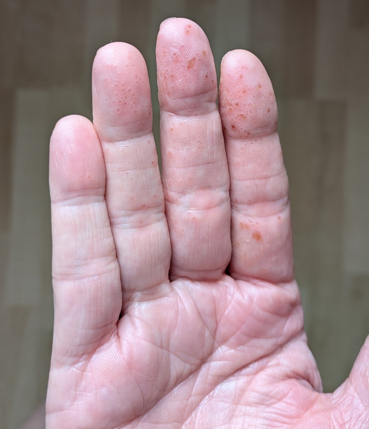 Guten Morgen Irmi 🙂 Oh Gott deine Füße sahen aber auch schrecklich aus. Wie hast du die Hyperkeratose in den Griff bekommen? Zwecks Epikutantests meinten alle nö das ist keine Kontaktallergie 🤦♀️.. In Heidelberg ist erstmal ein ganz normaler Vorstellungstermin. Ich habe nicht vor da stationär einzurücken, wenn dann teilstationär (was natürlich Stress ist wegen 1 Stunde Fahrzeit) aber ich habe Angst vor Krankenhäusern. Vill ist es bis März aber soweit gut, dass es sich erl. hat. Bei mir hat es im Sommer so höllisch gejuckt, da kann man nicht davon ablassen zu kratzen. Und es war alles feucht/nass darunter. In meiner Familie hat niemand diese Krankheit oder andere Hautprobleme. Es kam ganz plötzlich. Erst die Hände und ein paar Tage/Wochen später die Füße. Ich hatte im weiteren Verlauf auch mal vom Hausazt Kortison Tabletten bekommen; da wurde es auch besser aber kam natürlich schon währrend dem Ausschleichen der Tabletten zurück. Mir ging es selbst mit Standard Kortisontabletten richtig schlecht, also ich will mir gar nicht ausmalen, wie es mit Acitretin etc. wäre. Jetzt ist es so, dass alle paar Wochen neue Bläschen an den Händen kommen, diese kündigen sich an mit einem Druckschmerz und fühlt sich Wund an. Sie trocknen aber gleich aus und werden bräunlich. Ich habe das Gefühl, dass das Anzupgo eben diesen Prozess einfach drosselt. Vill. liegt es aber auch an der Jahreszeit. Mir grausts schon vor dem Sommer. Die Anzupgo Creme soll man lt. meiner Hautäztin nicht länger als 3 Monate nehmen und sie ist eigentlich auch nur für die Hände zugelassen. Ich bin grsapnnt, ob amn die Creme dauerhaft verschrieben bekommt. Die Standard Größe kostet 600€ .. Wie oft am Tag machst du sie drauf? Welche "Zwischenpflege" nimmst du? Ich würde gerne mal wieder ins Thermalbad gehen, traue mich aber nicht wegen der Nässe. Ich muss gleich nach dem Duschen die Füße eincremen, sonst ist Wüste an den Füßen angesagt 😏und alles spannt halt dauerhaft. Ich weiß gar nicht mehr, wie sich normale Hände und Füße anfühlen 😒 Ganz liebe Grüße und ich freue mich jemand gefunden zu haben zwecks Austausch 😄 PS: Wie alt bist du denn wenn ich fragen darf, wenn du Wechseljahre erwähnst? .. Ich bin 35 ..- 18 Antworten
