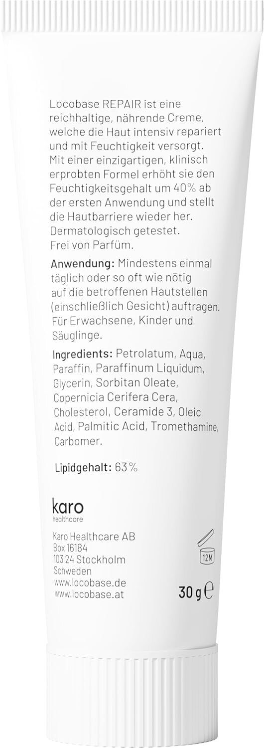 Locobase Repair ist zur Pflege bei trockener bis sehr trockener Haut gedacht. Sie soll die Hautbarriere stärken.